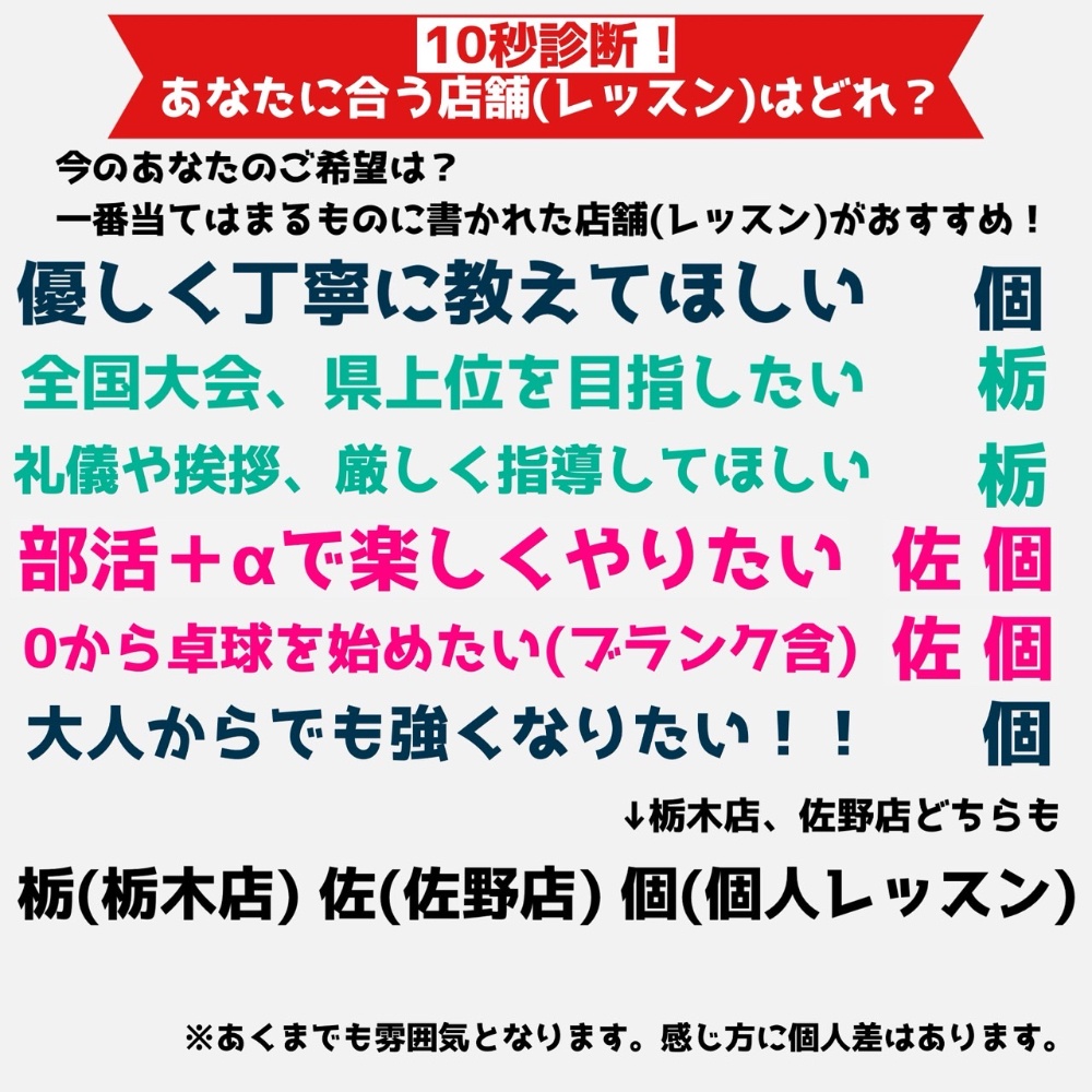| 提供内容 | ・台貸し ・個人レッスン(習いたい方) ・練習トレーナー (練習相手が欲しい方) ・卓球場での合宿可能 ・卓球場貸切 (イベントや大会使用可能) ・卓球教室 |
