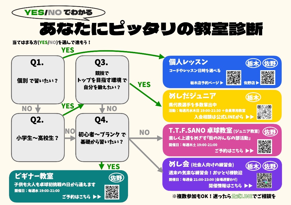 | 支払い方法 | 現金対応▶ ・個人レッスン ・練習パートナー ・各種教室 ・台貸し ・各種大会 PayPay対応▶ ・台貸し ・T.T.F.SANO卓球教室 ・ビギナー教室 |